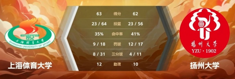末节争夺,两队围绕10分左右的分差展开拉锯战,章雨桐冲击篮筐继续拿分,陈可妍三分将分差缩小到4分打停扬州大学。暂停过后李欣雨高打板命中,冷佳乐造成三分犯规但3罚仅1中,扬州大学连投带罚扩大领先优势,双方争夺陷入白热化,祝凡超命中抛投,上海体大内外开花连得7分扳平比分,于庆雪两罚一中后扬州大学出现关键失误,许雨晨强投完成绝杀。最终,上海体大63-62逆转险胜扬州大学。