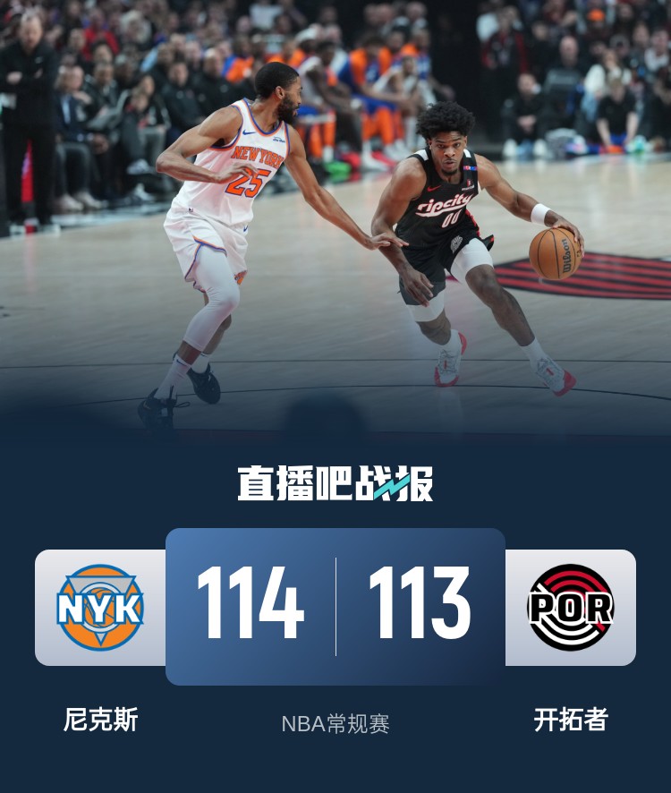 开场后两队打得十分激烈,场上比分也是交替上升,布里奇斯早早进入状态频频拿分。第二节两队依旧打得相当胶着,唐斯内线多次强打得手,卡马拉和夏普轮番砍分帮助开拓者紧追不舍。易边再战,阿努诺比用反击和三分为尼克斯先发制人,开拓者立马用一波7-0又将比分追上。最后一节两队依旧僵持不下,唐斯关键时刻连中两记三分,亨德森最后独得8分帮助开拓者将比赛拖入加时。加时赛中两队命中率都不理想,哈特发球失误,阿夫迪亚打成关键2+1反超比分,布里奇斯三分绝杀,最终尼克斯经过加时114-113险胜开拓者。