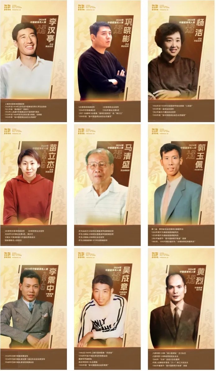 2024年中国篮球名人堂共产生9位入堂人物,杰出男运动员为:李汉亭、巩晓彬;杰出女运动员为:杨洁、苗立杰;杰出教练员为:马清盛;杰出裁判员为:郭玉佩;中国篮球先行者为:李震中、吴成章、黄烈。