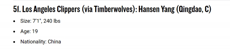 相较上期前进5位BR模拟选秀榜单:杨瀚森第51顺位被快船选中