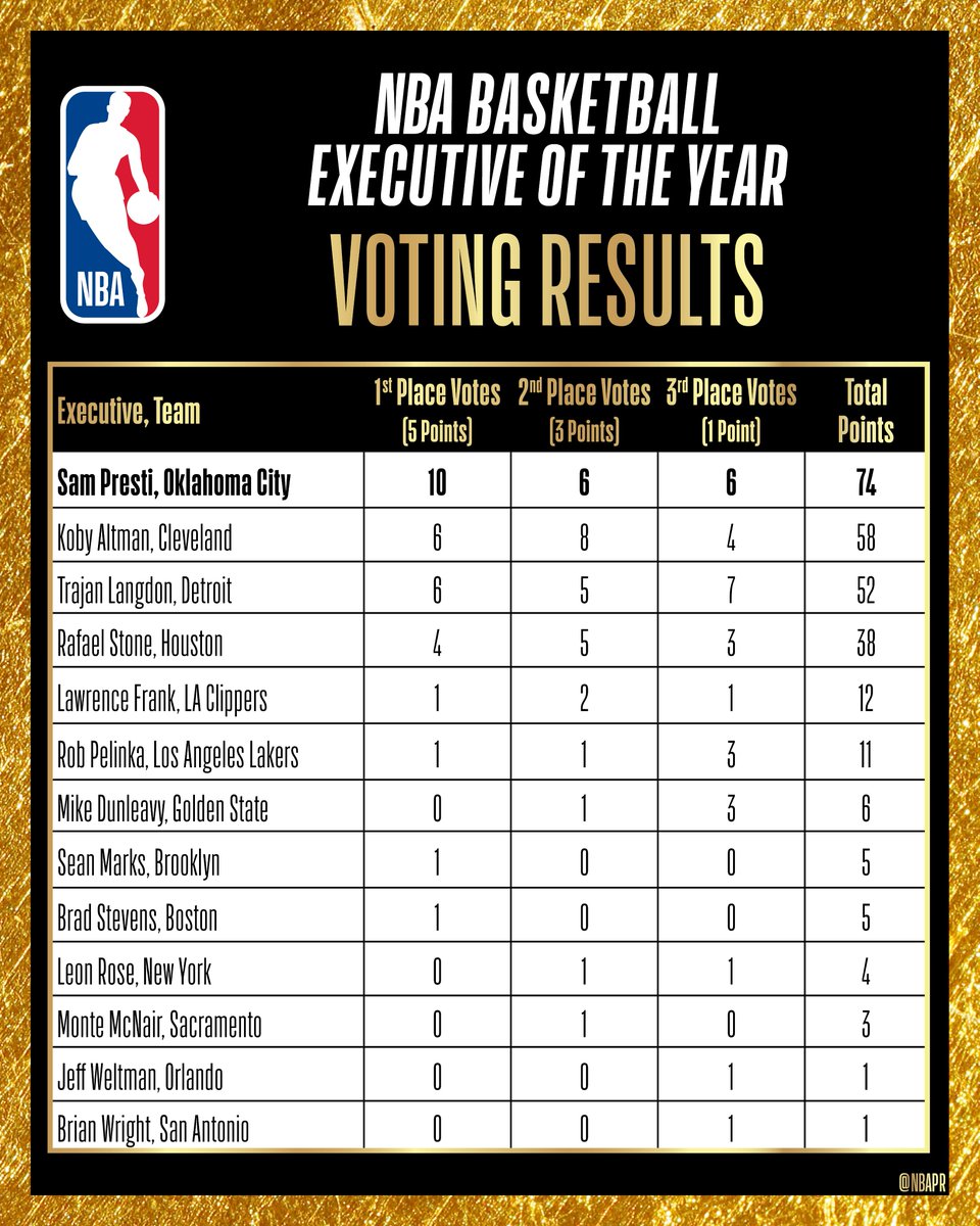 年度最佳高管得票情况:普雷斯蒂74分力压奥尔特曼 佩林卡第6