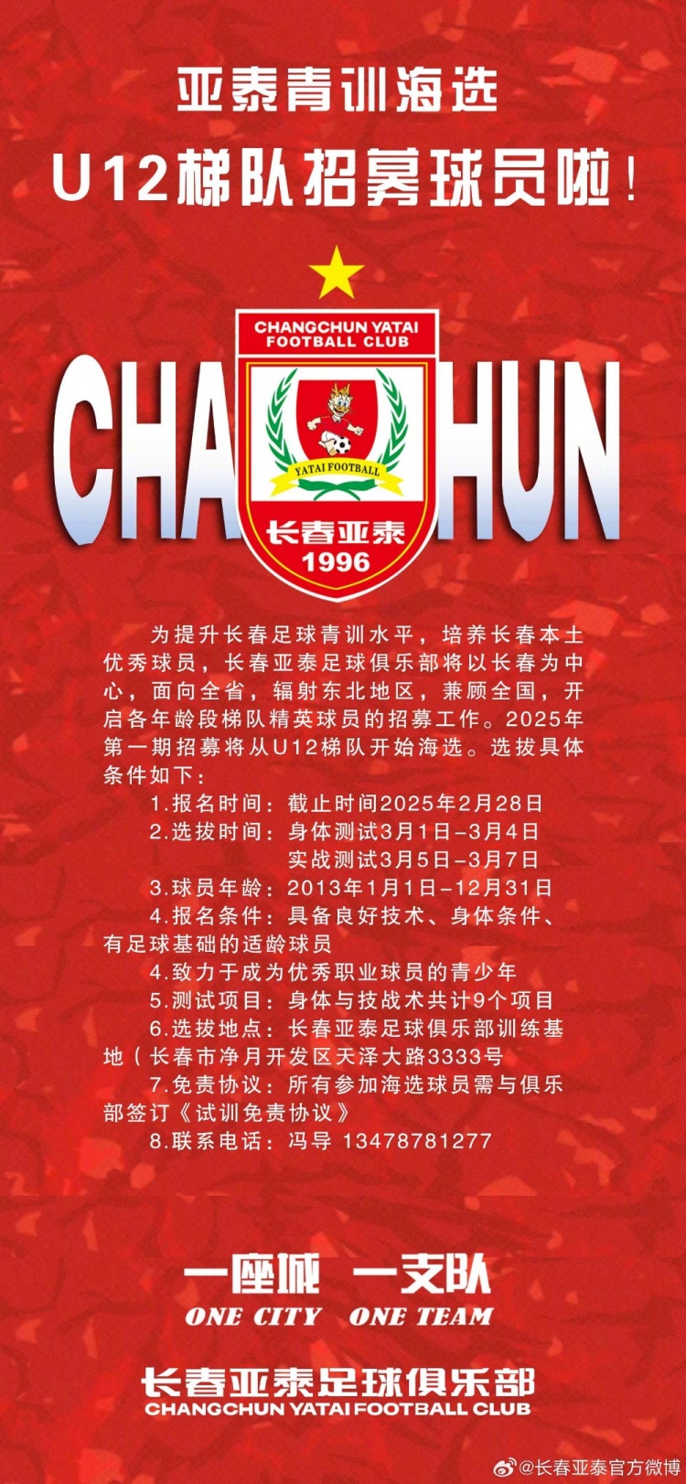 为了可持续发展战略,完善俱乐部梯队建设,长春亚泰足球俱乐部将立足本土,以长春为中心,面向全省,辐射东北地区,兼顾全国,开启各年龄段梯队精英球员的招募工作。2025年第一期招募将从U12梯队开始海选。