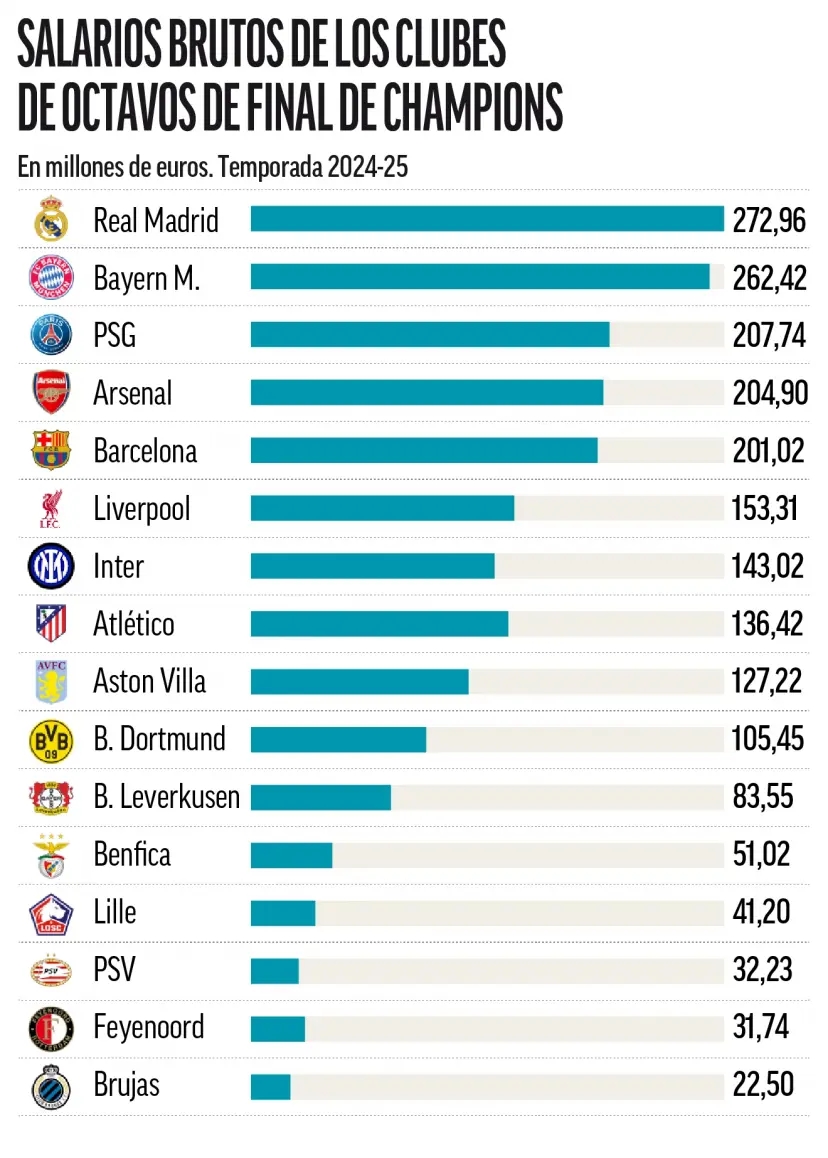 有五家俱乐部的薪资超过2亿欧元(皇马、拜仁、巴黎、阿森纳和巴萨),而四家低于5000万欧元(埃因霍温、费耶诺德、布鲁日和里尔)。今天和明天,这些低薪球队中会否有黑马杀入四强呢?