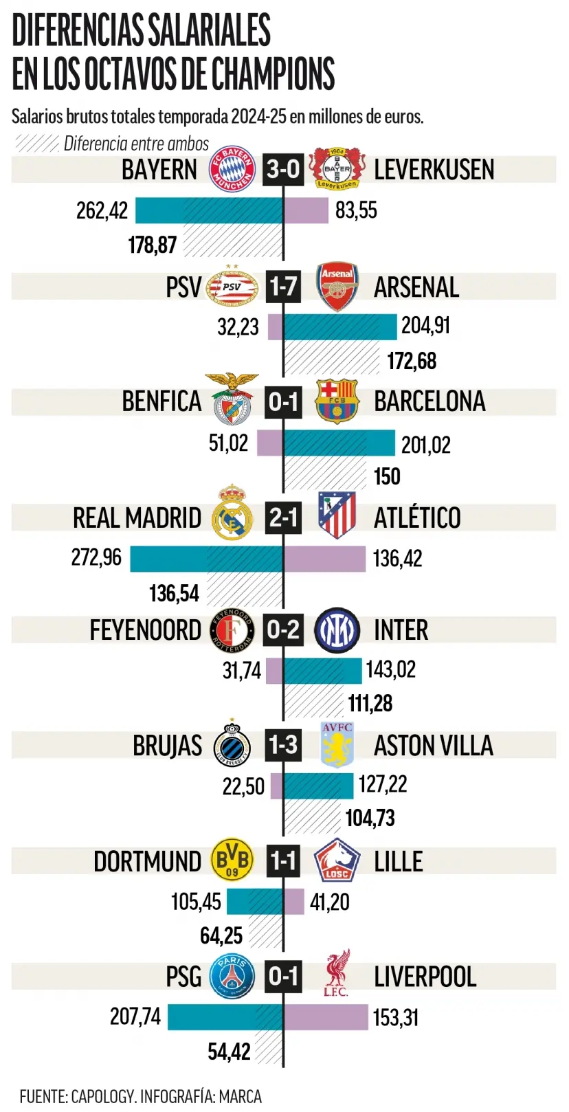 根据足球财务专业网站Capology的数据,如果以球员薪资支出为标准,最不平衡的淘汰赛是对阵拜仁和勒沃库森的比赛,拜仁的薪资支出几乎是对手的三倍(2.624亿欧元对8350万欧元)。第二大差距出现在阿森纳与埃因霍温的对决中,阿森纳球员的2.049亿欧元薪资远超埃因霍温的3220万欧元,差距高达六倍。第三个薪资差距较大的对决是本菲卡与巴塞罗那,巴萨球员的薪水是葡萄牙球队的四倍(2.01亿欧元对5100万欧元)。皇马与马竞的阵容薪资差距恰好是两倍,皇马为2.729亿欧元,马竞为1.364亿欧元。