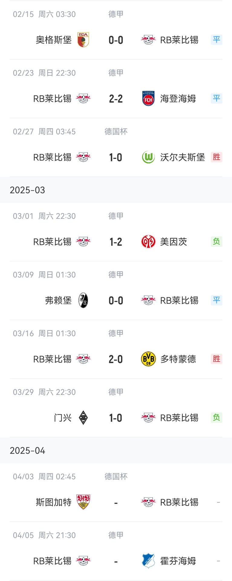 RB莱比锡近期战绩↓