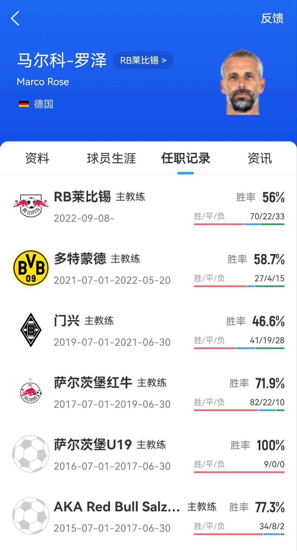 现年48岁的罗泽在2022年9月成为RB莱比锡莱比锡主帅,带队战绩127场72胜22平33负。在罗泽执教的第一个赛季,RB莱比锡就拿下了德国杯冠军,并在2023/24赛季3-0完胜拜仁,拿到了德超杯冠军。