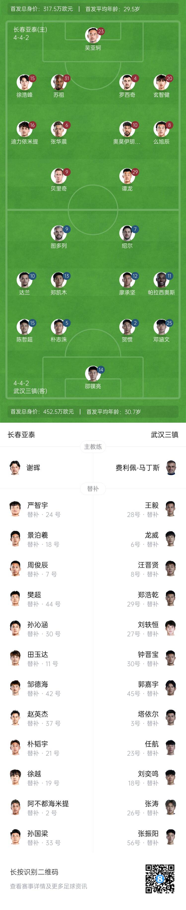 04月02日讯 北京时间15:30,中超第4轮,长春亚泰坐镇主场长春体育中心体育场迎战武汉三镇。赛前双方的首发阵容出炉。