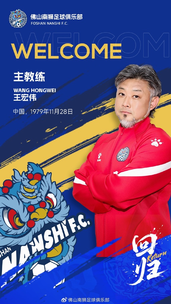 鉴于俱乐部的发展需求,经过慎重研究与决策,即日起王宏伟正式担任佛山南狮一线队主教练。在2025赛季,他重返球队,将带领南狮将士们迎接新的挑战,为城市荣耀而战!
