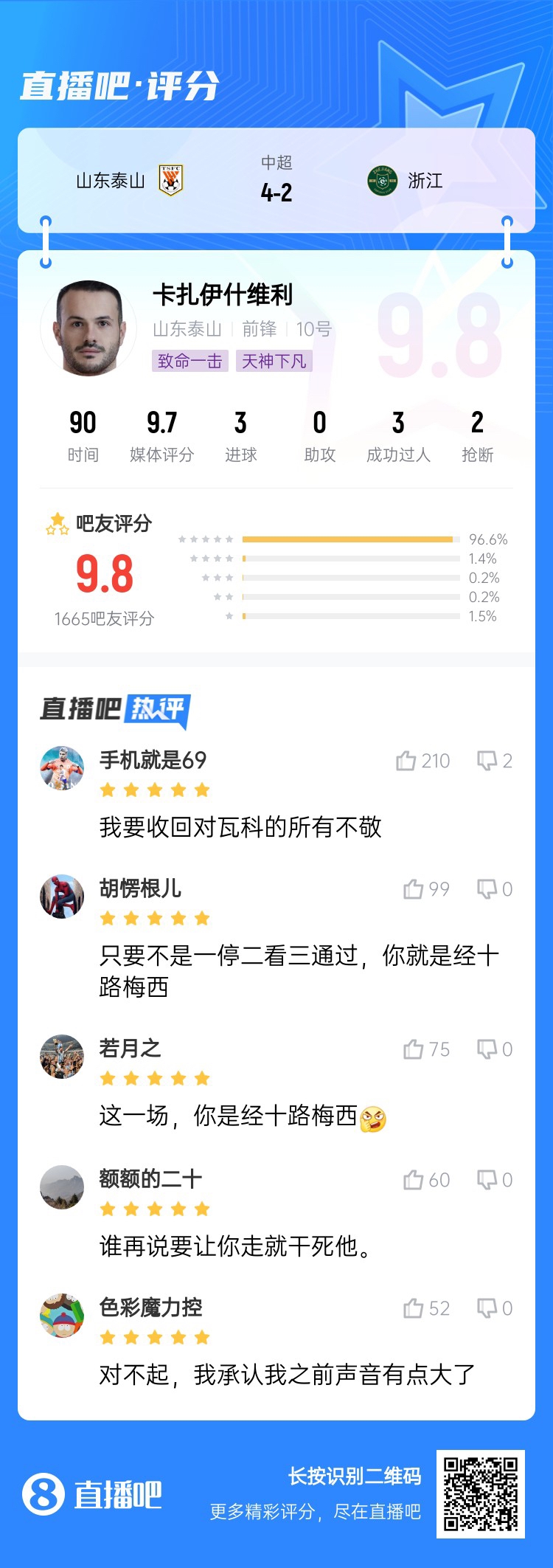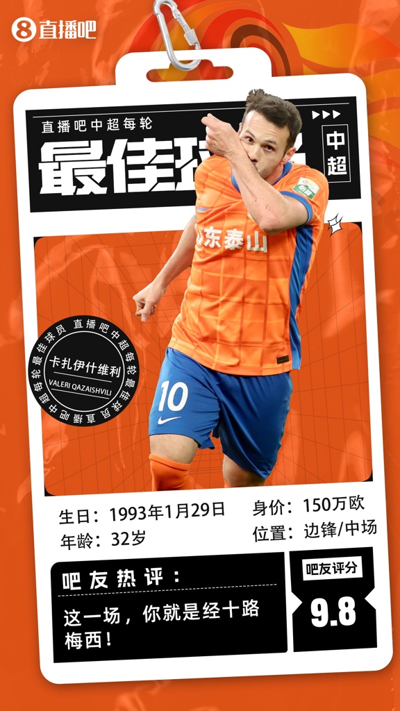 【直播吧】中超第12轮最佳球员:帽子戏法助泰山逆转!卡扎首当选