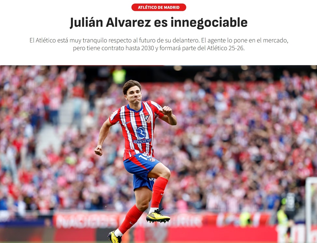 任何一支球队想要挖角阿尔瓦雷斯都需要付出极大的代价,就目前来说,除非向马竞支付5亿欧元的解约金,否则他们不会放人。