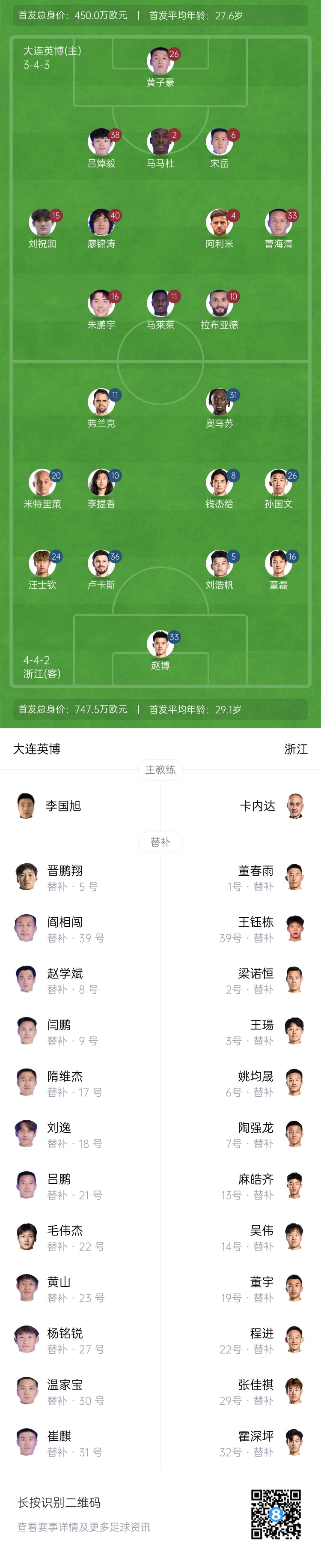06月30日讯 今晚19:35中超第16轮,大连英博vs浙江。赛前首发已经公布。